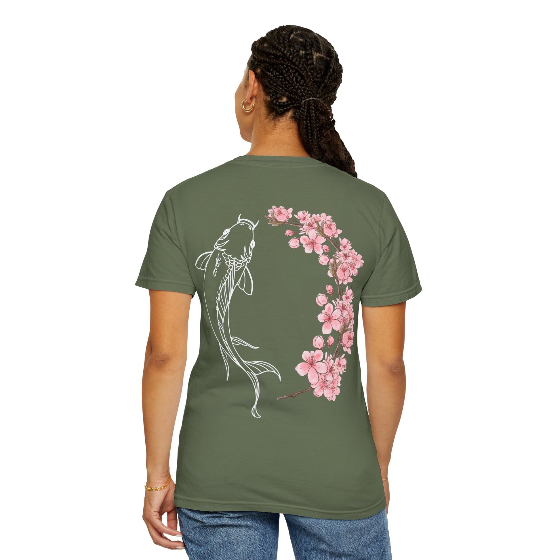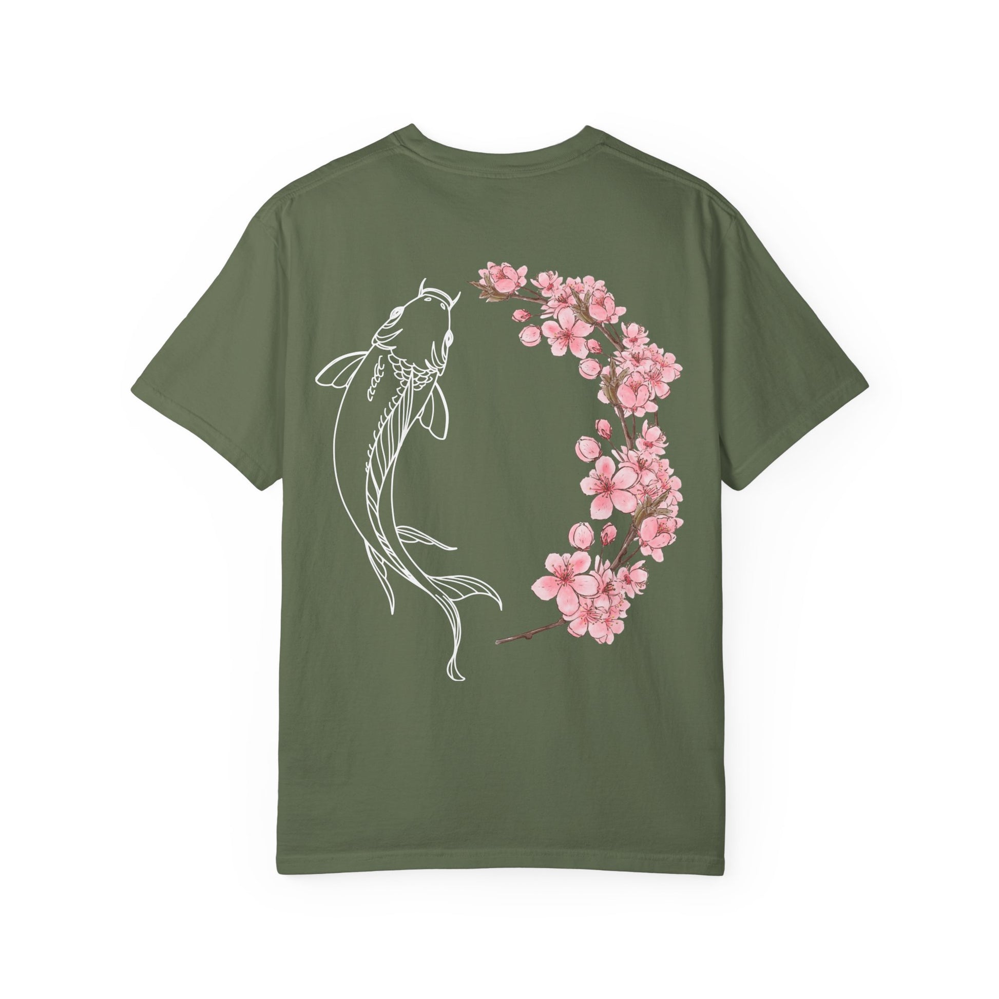 This fun t-shirt features a design that says 'cool koi' on the front and a koi fish with pink flowers in the shape of a circle on the back. It gives off a relaxed and playful vibe, perfect for casual wear. Ideal for those who love nature-inspired designs and want to stand out with a unique t-shirt. Perfect for gifting on birthdays, holidays, or just because.